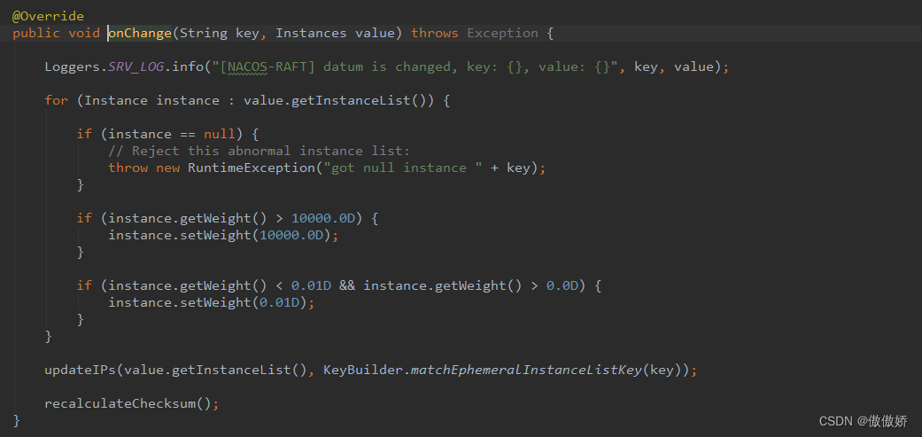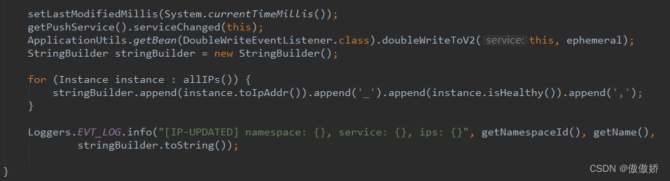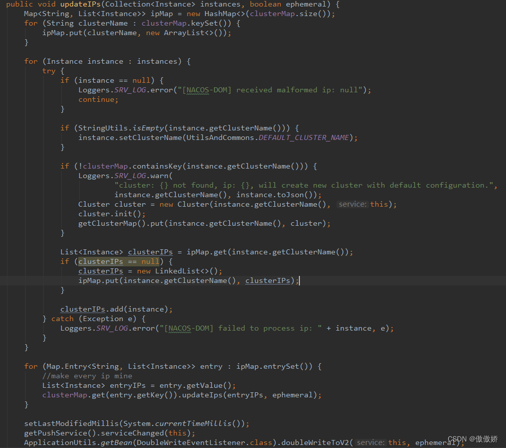 主要看updateIPs方法,首先构建一个map,用来存clusterMap的key,然后值为更改后的值。而不是直接更新clusterMap的数据。更新cluster实例列表,发送一个ServiceChange的事件,最后调用doubleWriteToV2