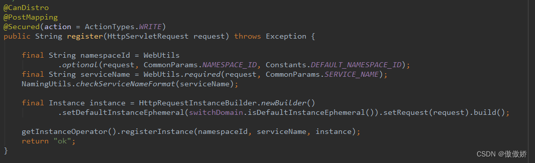 刚才说到客户端会发送请求到服务端,/nacos/v1/ns/instance 这个请求,在InstanceController这个类中,可以找到我们的那个请求。