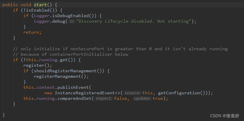 start方法中主要是register注册到注册中心,和发送一个InstanceRegisteredEvent事件,最后将running状态改为true,注册完成。