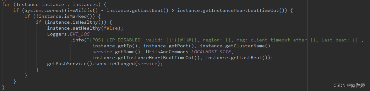 第二遍历所有实例,当前系统时间减去上次心跳时间如果大于15秒则将服务的healthy设置为false,并发送事件。