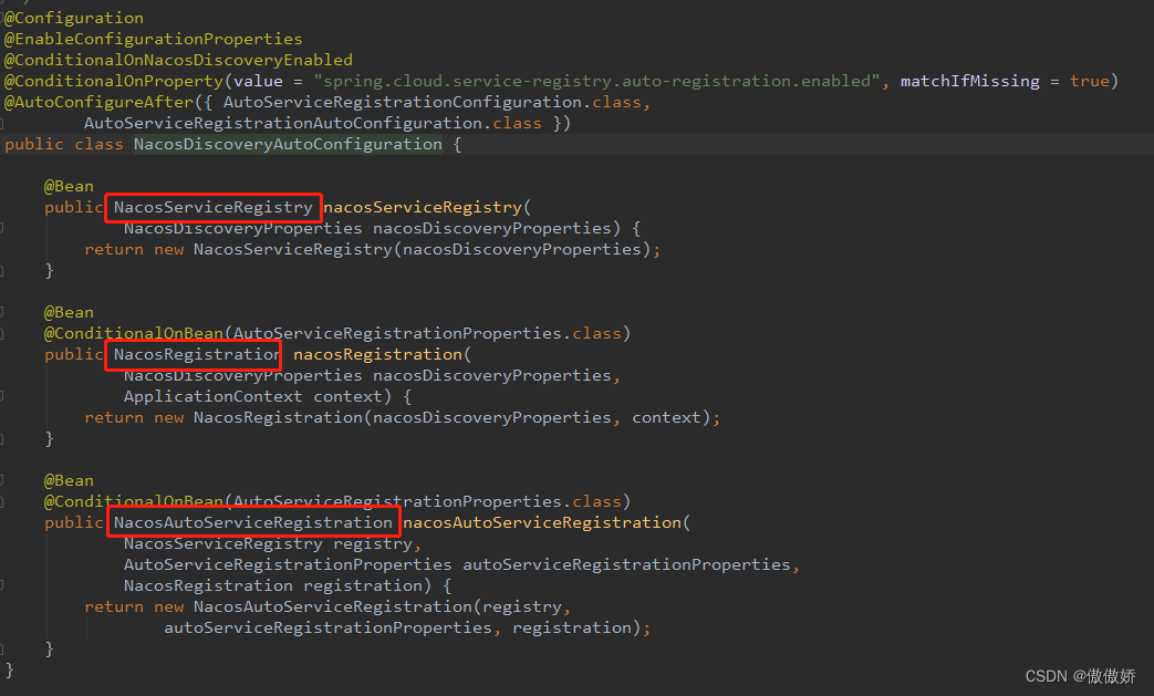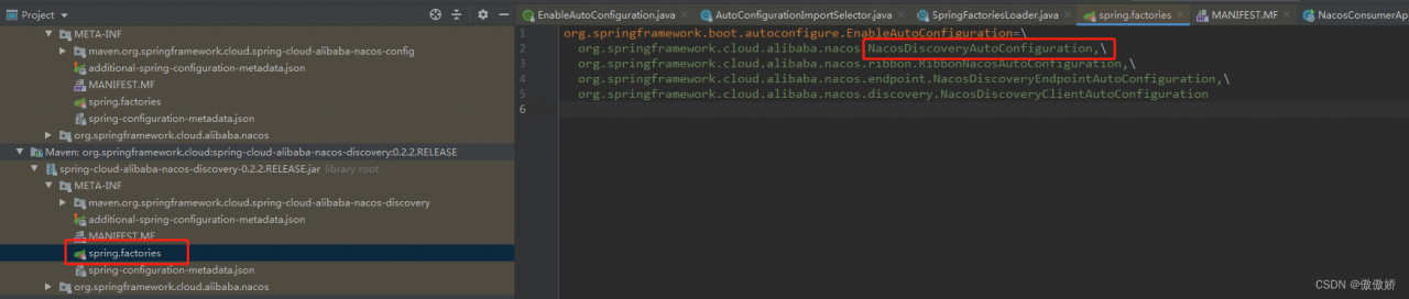 首先根据springboot的自动配置,找到META-INF/spring.factories文件,可以找到NacosDiscoveryAutoConfiguration这个自动化配置的类