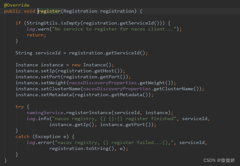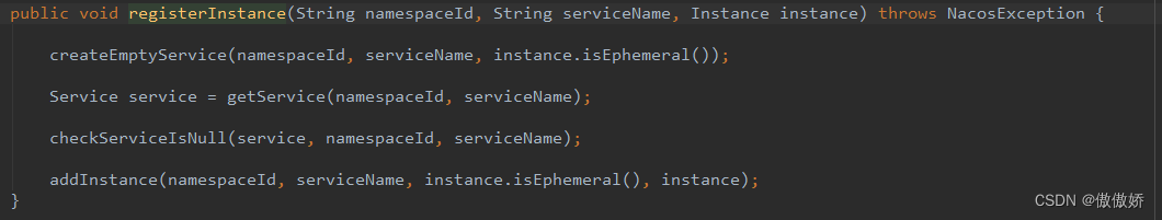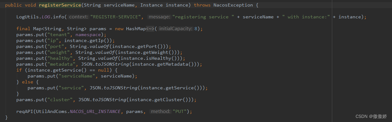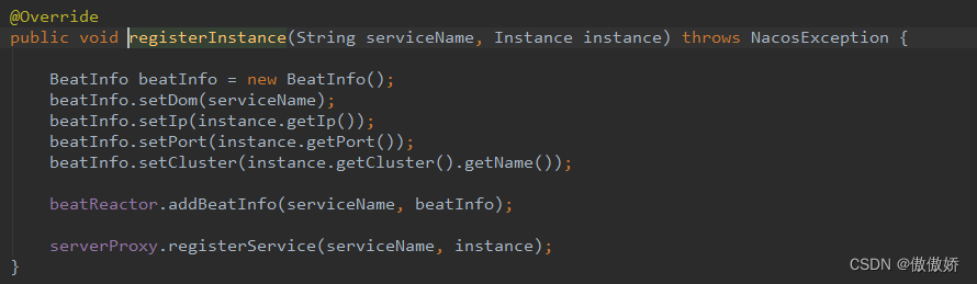 NacosNamingService类中的registerInstance方法中,主要做了两件事,一个是beatReactor.addBeatInfo方法,一个是serviceProxy.registerService方法。前面一个是发送心跳信息,后面一个是将服务注册到注册中心。