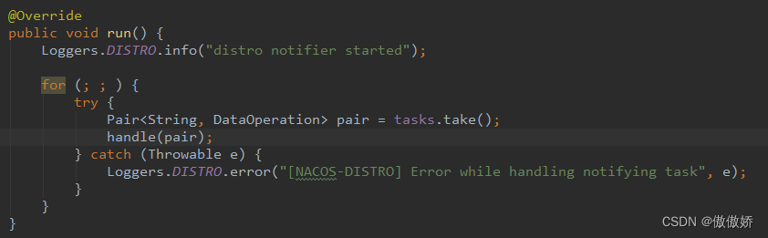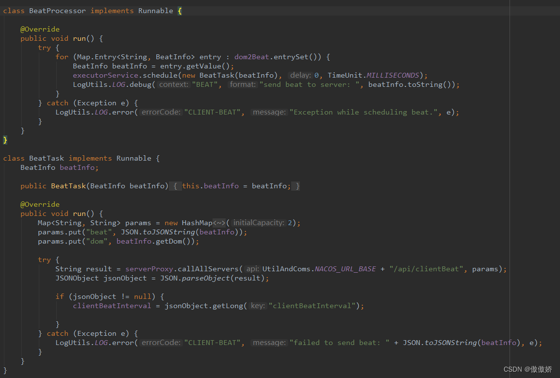 而他的构造方法如下,他会执行这个定时任务的线程,每十秒钟,执行的是BeatProcessor这个线程中的run方法,而在BeatProcessor的run方法中,遍历dom2Beat这个map中的BeatInfo信息,然后,每一个Service都会开启一个BeatTask的定时任务,每一微秒执行serverProxy.callAllServers(UtilAndComs.NACOS_URL_BASE + "/api/clientBeat", params);