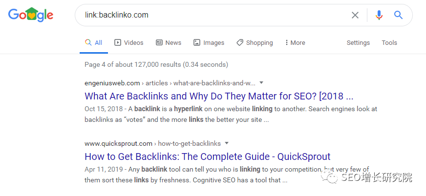 比如,link:backlinko.com找到的结果就是所有链接到backlinko.com的页面。