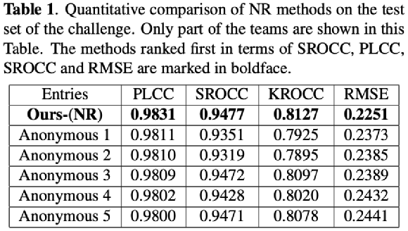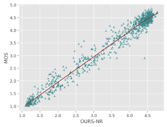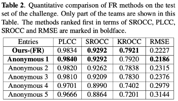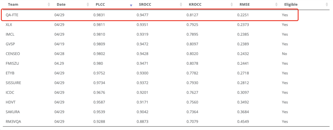 通过对比竞赛结果中的各队伍在测试集上的性能指标(PLCC/SROCC/KROCC/RMSE)以及SOTA FR/NR算法预测质量分数散点图,对提出模型的性能进行验证,其中PLCC/SRCC/KROCC越接近1越好,RMSE越接近0越好。