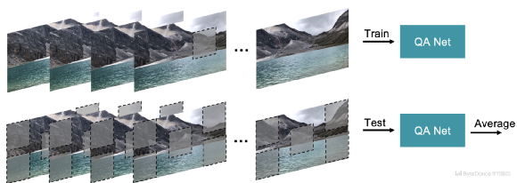 如下图所示,在训练过程中,从压缩视频片段和相应的参考视频片段中随机裁剪出一个256×256的图像块patch(针对FR框架),然后将压缩视频的质量评分直接作为裁剪patch的训练标签。测试时,从每一帧的四个角和中心裁剪得到5个大小为256×256的patch分别计算分值(FR框架),所有patch的平均得分作为压缩视频的预测分。