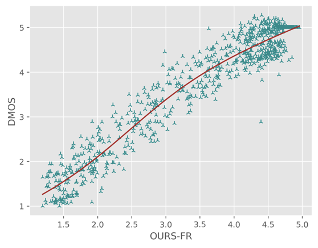对于直接预测压缩损伤视频MOS分的NR方法,火山引擎多媒体实验室提出的NR框架在所有评价指标中排名第一;对于预测参考视频和损伤视频质量差异DMOS分值的FR方法,火山引擎多媒体实验室提出的FR框架在预测单调性(即SROCC和KROCC)方面排名第一,在预测精度(即PLCC和RMSE)方面排名第二。同时通过散点图可以看出,提出的方法与主观评分具有较高的相关性,显著超出了其他的SOTA FR/NR方法。