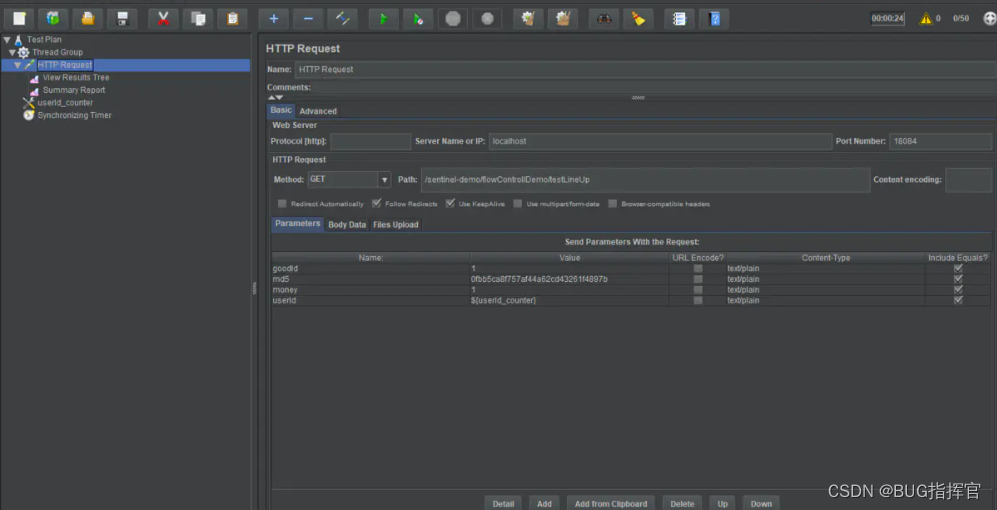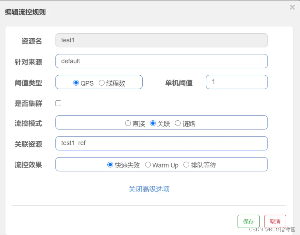 选择QPS,单机阈值为1,选择关联,关联资源为/test_ref,这里用Jmeter模拟高并发,请求/test_ref。