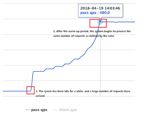 默认 coldFactor 为 3,即请求 QPS 从 threshold / 3 开始,经预热时长逐渐升至设定的 QPS 阈值。