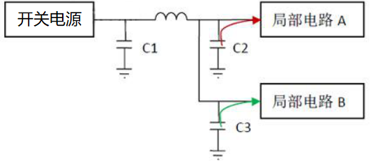 增加了C2后,局部电路再需要一个瞬间的大电流的时候,电容C2可以为A暂时提供电流,即使共路部分电感存在,A端电压不会下降太多。对B的影响也会减小很多。于是通过电流旁路起到了退耦的作用。