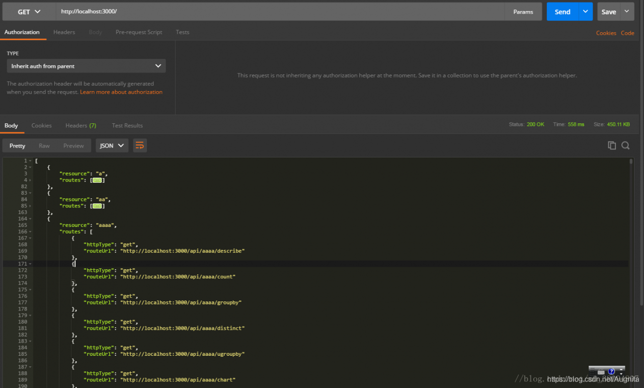然后打开:http://localhost:3000就可以看到上面数据库相关的一堆json,找到你要查选的对应表,然后在postman中起一个get请求即可查询该表所有数据,可以在Test中添加相应的解析脚本判断查出的结果中是否包含期望的数据: