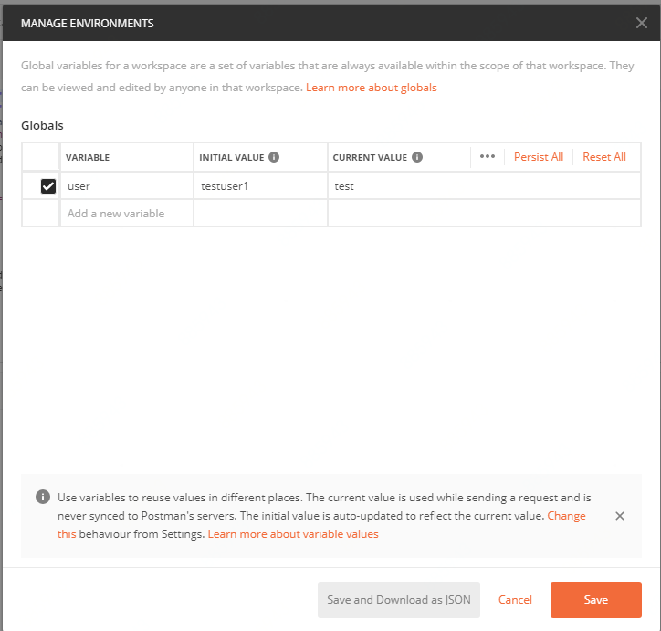 全局变量可用于postman 所有接口,设置方式如下图,其中Initial value是一个初始值到处是可用于分享于他人,current Value是至当前工程所使用的value