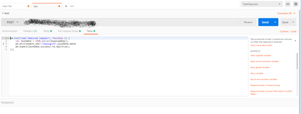 测试脚本可用于设计接口测试断言,可以分析response内容或者判断请求结果及状态等。右边提用了很多snippets可供参考使用,支持JS语言,也可以自己写一些辅助脚本来使用