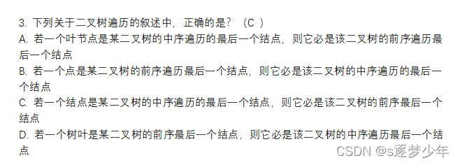 因此我们从遍历的顺序知:先序和中序的末尾都为右节点;因此选C