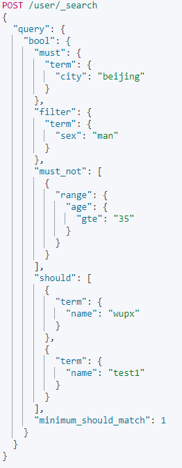 上图是一个 bool 查询,是对用户(user)进行搜索,城市必须是北京(beijing) ,性别必须是男(man),这个采用的是 filter,说明这个对算分是不会产生影响的,must_not 是一个 range 的查询:年龄大于等于 35 岁;should 里是一个数组,说明这个 should 中可以写多个条件,只要用户的名字是这两个中的一个就是满足条件的。