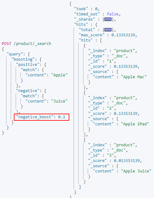 如下图所示,左边就是一个 Boosting Query,positive 查询意思是如果 content 中包含 Apple 会按照原始的相关性分数进行打分,negative 查询则是满足 positive 查询同时满足 negative 查询(content 中包含 Juice)的会按照原始的相关性分数乘以 negative_boost 进行打分,negative_boost 是用于降低与 negative 匹配文档的相关性算分的。