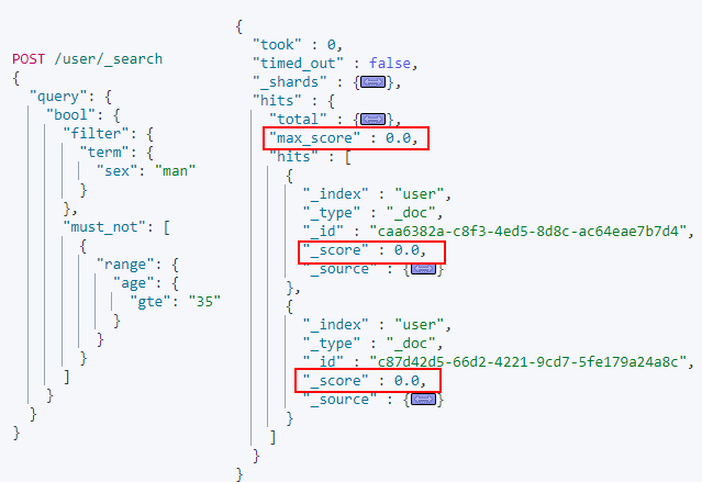 上面说到了 filter 和 must_not 是不会影响算分的,通过查询结果中可以看到 _score 都是 0。