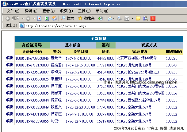 //第三行表头 tcHeader.Add(new TableHeaderCell()); tcHeader[6].Attributes.Add("bgcolor", "Khaki"); tcHeader[6].Text = "身份证号码"; tcHeader.Add(new TableHeaderCell()); tcHeader[7].Attributes.Add("bgcolor", "Khaki"); tcHeader[7].Text = "姓名"; tcHeader.Add(new TableHeaderCell()); tcHeader[8].Attributes.Add("bgcolor", "Khaki"); tcHeader[8].Text = "出生日期"; tcHeader.Add(new TableHeaderCell()); tcHeader[9].Attributes.Add("bgcolor", "Khaki"); tcHeader[9].Text = "薪水"; tcHeader.Add(new TableHeaderCell()); tcHeader[10].Attributes.Add("bgcolor", "Khaki"); tcHeader[10].Text = "家庭住址"; tcHeader.Add(new TableHeaderCell()); tcHeader[11].Attributes.Add("bgcolor", "Khaki"); tcHeader[11].Text = "邮政编码"; break; } } }