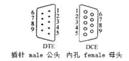 而CPU 和终端则采用TTL 电平及正逻辑,TTL 电平用+5V 表示逻辑1,0V 表示逻辑0,它们与EIA采用的电平及负逻辑不兼容,需在接口电路中进行转换。EIA-RS-232C 标准没有定义连接器的物理特征.因此出现了DB-25、DB-15 和DB-9 各种类型的连接器,PC 机的COM1和COM2串行接口采用DB-9连接器。ELA-RS-232C 标准规定,当误码率小于4%时,允许导线长度15m 。实际应用中,当使用9600b/s、普通双绞屏蔽线时,传输距离可达30m ~35m 。PC 机的COM1和COM2两个串行接口采用的DB-9连接器是公( 针) 头,提供异步通信的 9 个引脚功能。分别为:①脚 (DCD) 数据载波检测,②脚 (RXD)接收数据,③脚(TXD) 发送数据,④脚 (DTR) 数据终端准备,⑤脚 (SG) 信号地,⑥脚 (DSR) 数据设备准备好,⑦脚(RaS)请求发送,⑧脚 (CTS) 清除发送,⑨脚 (RI) 振铃指示。DB-9 公( 针) 头排列顺序如下图左,DB-9母(孔)头排列顺序如下图右,特别注意公头引脚号从坐到右,母头是从右到左。EIA-RS-232C 标准中 , 有三个发送信号:TXD 、RTS 和DTR,每根线的典型输出电流为±8mA/±12V 。通常由RTS和DTR供电的话,可提供约192mW 功率。
