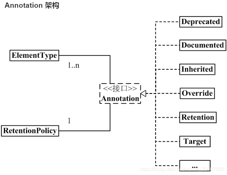 "每 1 个 Annotation" 都与 "1 个 RetentionPolicy" 关联,并且与 "1~n 个 ElementType" 关联。可以通俗的理解为:每 1 个 Annotation 对象,都会有唯一的 RetentionPolicy 属性;至于 ElementType 属性,则有 1~n 个。