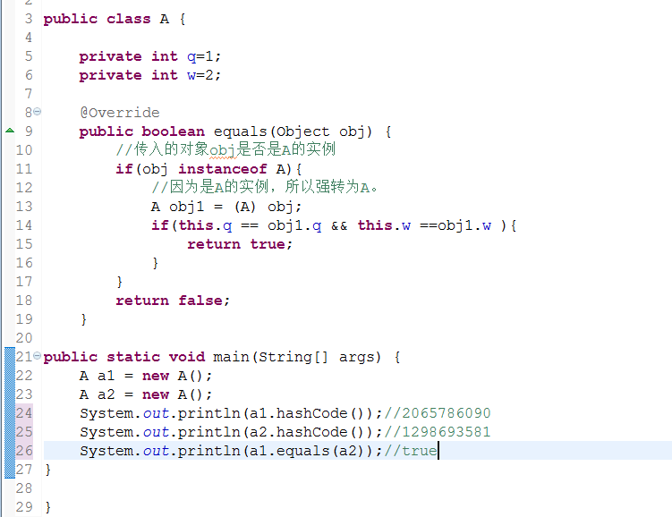 比如:有个A类重写了equals方法,但是没有重写hashCode方法,看输出结果,对象a1和对象a2使用equals方法相等,按照上面的hashcode的用法,那么他们两个的hashcode肯定相等,但是这里由于没重写hashcode方法,他们两个hashcode并不一样,所以,我们在重写了equals方法后,尽量也重写了hashcode方法,通过一定的算法,使他们在equals相等时,也会有相同的hashcode值。