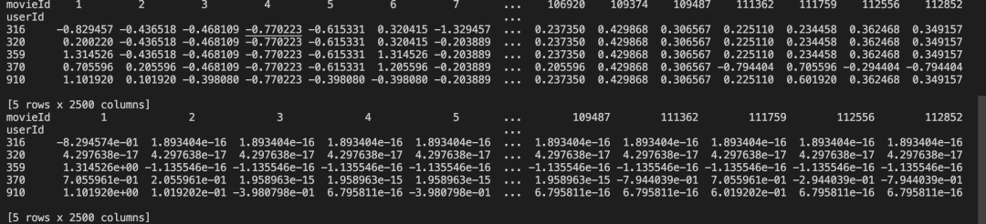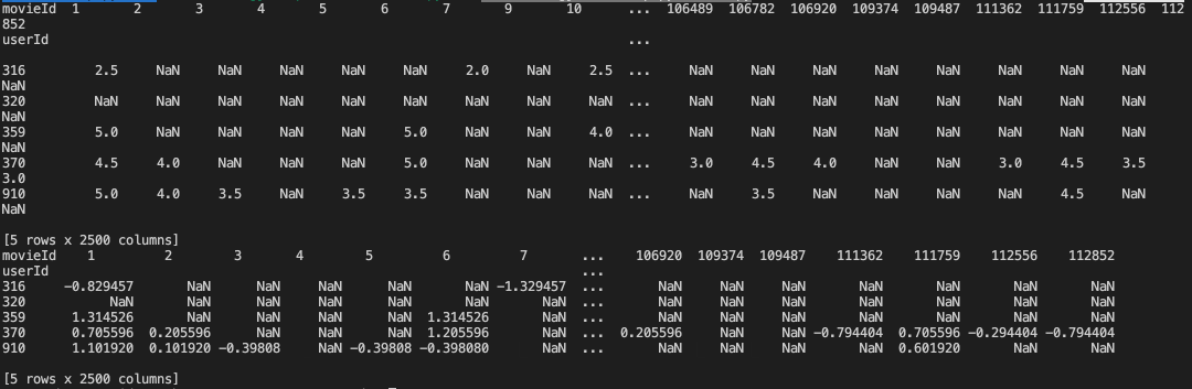 上图中包含了很多NaN的值,这是因为每个用户都没有看过所有的电影,所以这种类型的矩阵被称为稀疏矩阵。类似矩阵分解的方法被用来处理这种稀疏性,接下来,我们来对这些NaN值做相关替换。