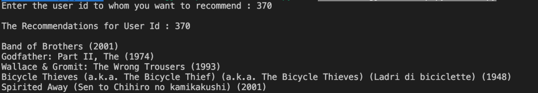 这里我们算出来的预测分数是4.25,因此可以认为用户(370),可能喜欢ID(7371)的电影。接下来,我们给用户(370)做电影推荐,实现代码如下: