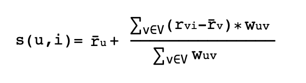 这里给非个性化协同过滤(不包含活跃用户的喜欢、不喜欢、以及历史评分),返回一个以用户U和物品I作为输入参数的分数。该函数输出一个分数,用于量化用户U喜欢 / 偏爱物品I的程度。这通常是通过对与用户相似的人的评分来完成的。涉及的公式如下: