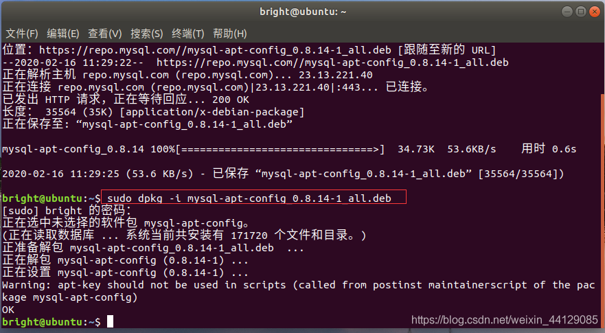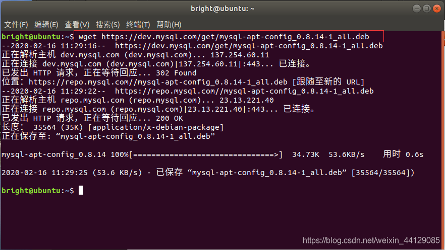 - 然后进入Ubuntu系统,打开终端,并输入以下命令,进行下载MySQL APT配置包