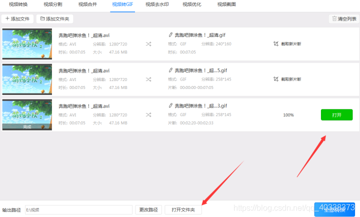 5、点击“转换GIF”或“全部转换”按钮把avi视频转换成gif动态图。当转换完成后点击覆盖在‘转换GIF’按钮上的“打开”按钮或点击“打开文件夹”按钮就可以直接到达输出路径打开转换后的gif动态图。