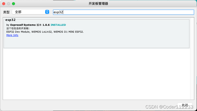 然后找到:工具 → 开发板 → 开发板管理器,搜索esp32,这个时候就出现了esp32的板子了
