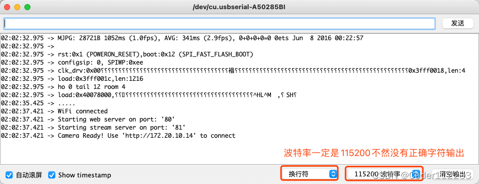然后你打开串口监视器,波特率设置为115200,重启板子,可以看到板子的ip,浏览器输入ip就能够看到摄像头的图像了