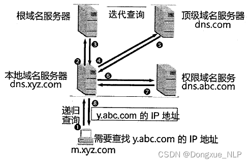 主机向本地域名服务器的查询采用递归查询,本地域名服务器向根域名服务器的查询差用迭代查询。
