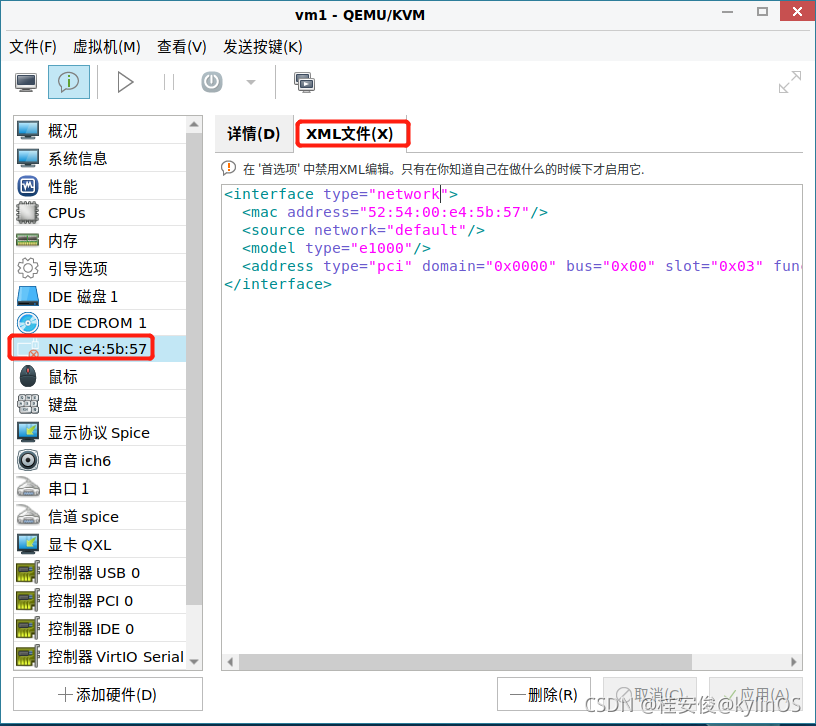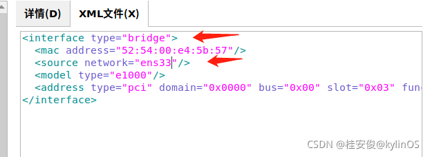 打开虚拟机配置详情,在网卡的xml配置文件中对于配置改为bridge,(注:如果xml不能直接编辑,可根据提示在首选项中打开xml编辑权限)