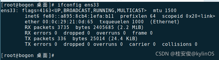 此时, 作为网桥借口的附庸(slave),物理网口 ens33 接口没有自己的 IP 地址, 网桥寄生在它身上。