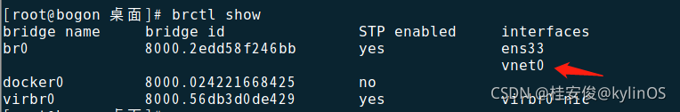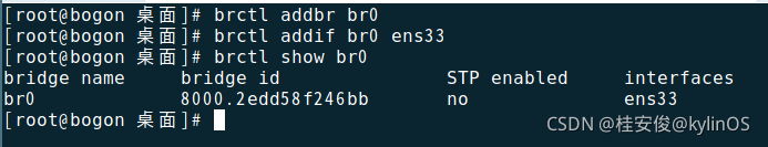 # brctl addif br0 ens33 //ens33为宿主机实际准备用于桥接的网卡名,根据实际名称对应修改 # brctl show br0