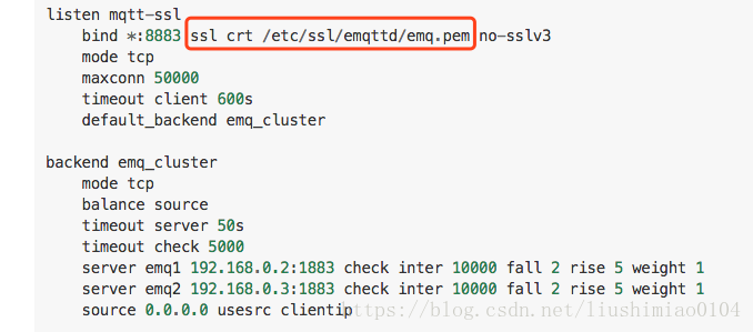 本人使用官方文档配置导致haproxy启动失败,首先没有emq.pem这个文件,其次属性ssl crt也无法识别。这或许是个坑吧,暂时不深究原因,如果有朋友知道的也烦请告知一二。