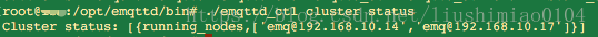 3、节点加入集群在14服务器上执行(也可在17服务器上执行):$ ./bin/emqttd_ctl cluster join emq@192.168.10.17