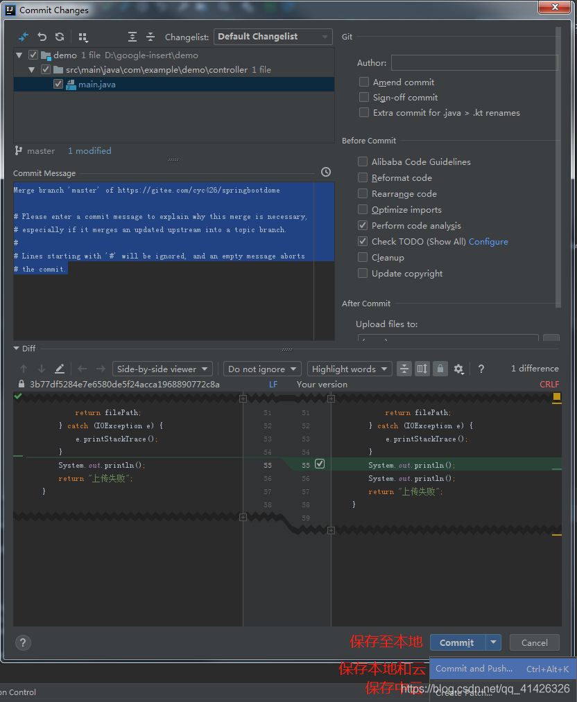 commit File到本地仓库,我们选择commit and push保存到本地及云中