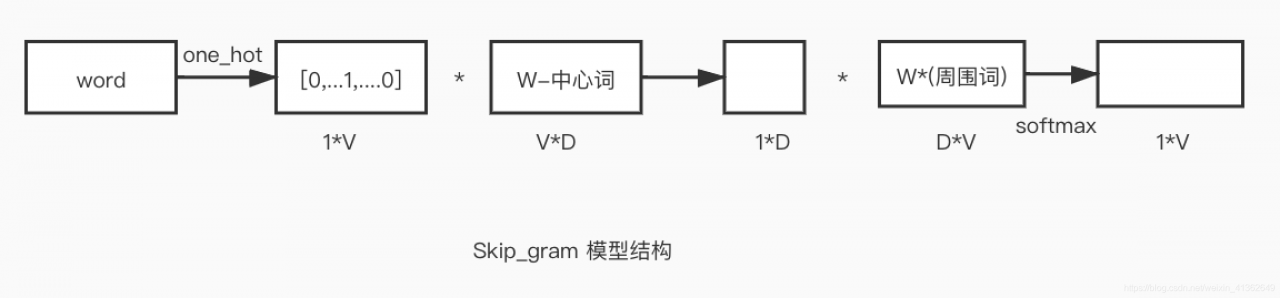 输入层: 将词映射成向量,相当于一个1*v的one-hot向量乘以一个v*d的向量得到一个1*d的向量