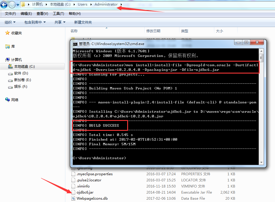 将下载好的ojdbc6.jar复制到系统默认的用户目录下,我的用户目录是C:\Users\Administrator,然后在该目录下打开命令窗口,然后输入如下命令:(注意:若安装了多个maven,要删除一个)