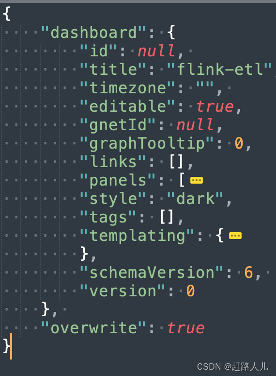 其中,panels是我们定义的各种panel信息,templating是我们定义的variable(早起grafana版本我们定义的变量就叫templateing) 。只需要将上面json中的panels和templating节点拷贝到那个格式中即可:
