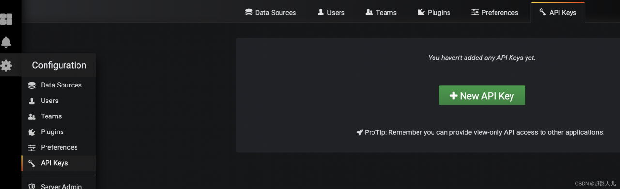 我们都知道,要想掉用grafana的api需要鉴权,可以进去grafan页面,按照下面方式申请api key:
