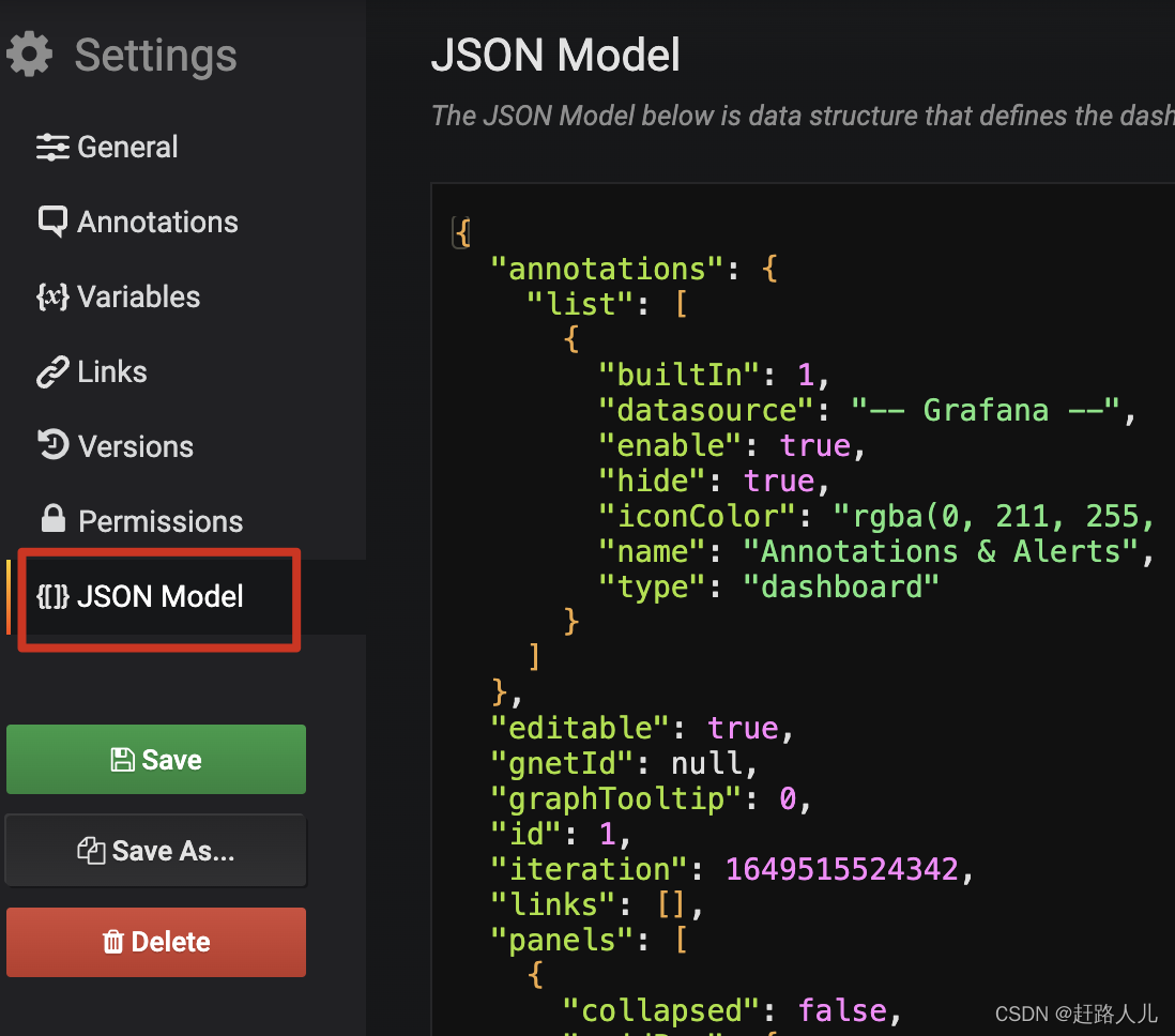 首先在grafana中通过json model来导出我们的dashboard(带有variable),格式如下: