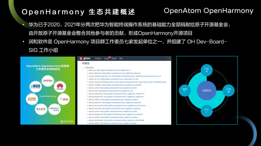 2021年12月28日, OpenHarmony开源见面会首站在南京顺利举办,润和软件石磊在Dev-Board-SIG分论坛上进行了主题为“RK3568标准系统芯片平台适配” 的分享。演讲分三个章节展开,介绍了润和软件作为共建单位的整体发展战略及参与OpenHarmony共建的一些落地案例,也详细介绍了未来一段时间内的具体开源计划。