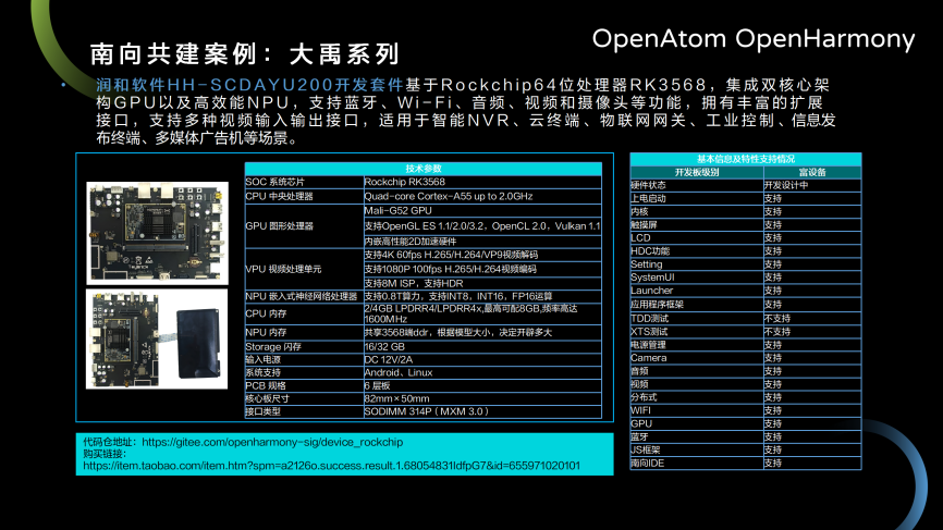 DAYU200作为首个OpenHarmony 主线支持的三方芯片标准系统设备,经过润和和基金会同事的共同努力,已经在Gitee OpenHarmony 项目开源。 首批开源的能力包含显示,触摸能力,媒体能力支持Camera预览,拍照,录像, Audio支持录音,音频播放, Video 支持视频软解码,支持Mali GPU渲染。 支持WIFI 功能,HDC 调试等。