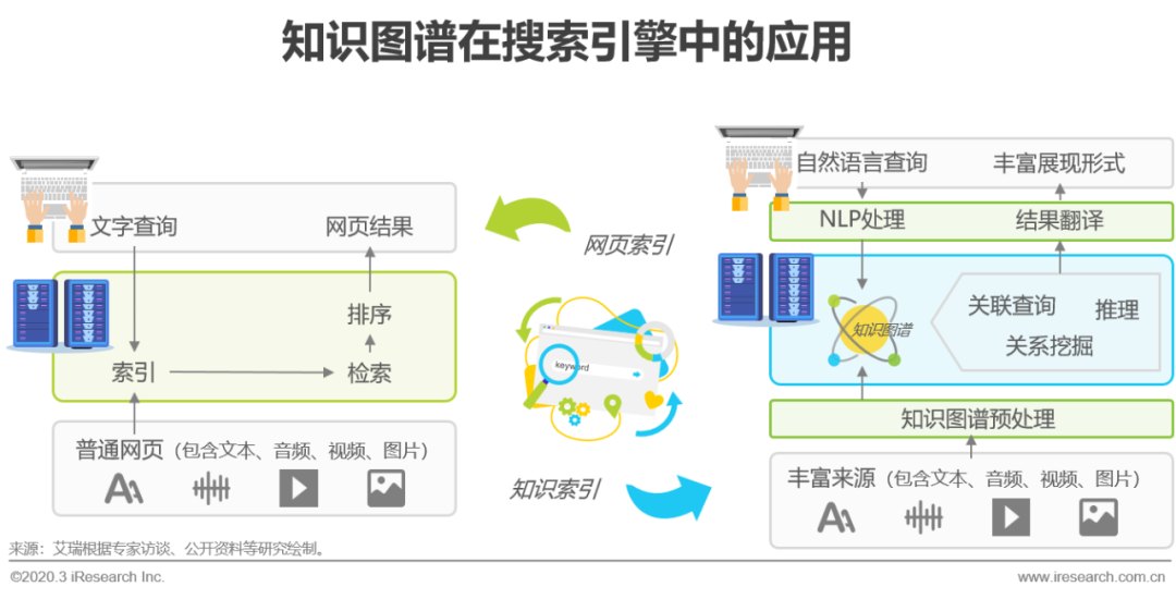 搜索引擎是互联网发展中最具代表性的应用之一,它解决了人们如何方便获取信息的问题,一度成为大部分流量的入口。但随着网络中信息沉积越来越多,人们真正需要的,隐藏在大量无用信息中有价值的部分,我们称之为知识的内容,往往得不到直观展现,这成为了搜索引擎领域重点要解决的问题。2012年5月,谷歌率先提出知识图谱概念,用以更好的描述现实世界中实体关联性问题,进而提高信息搜索中的知识获取效率,随后搜狗、微软、百度纷纷推出相关概念架构,知识图谱被视为下一代搜索引擎的核心技术。传统搜索引擎一般采用网页索引,按照“网页--(预处理)--> 临时库 --(索引)--> 索引好的库 --(由用户行为触发检索)--> 为用户展示网页结果”的流程执行,信息源来自网页,展现内容也是网页链接。而基于知识图谱的搜索作为和网页索引同级、并行的另一套知识索引,更注重信息间的关联性和自然语言理解,通过图存储的形式从新组织互联网中的信息,再以人类的语言习惯进行查询和展现,从而提高搜索体验,因为知识的存储形式发生了变化,所以知识索引信息来源和展现载体都不再局限于网页文字,语音交互和更加丰富的IoT场景将会是未来的发展方向。