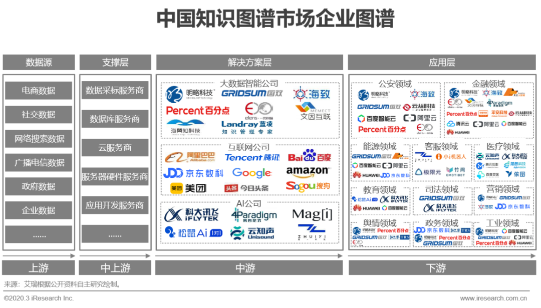 中游解决方案提供方进行全流程服务,是产业链核心环节,中国知识图谱市场产业链上游主要以各类数据源企业或机构为主,因所处理数据多具有敏感性和专属性,所以往往数据源也是服务的需求方;中上游主要包括数据采集服务商、数据库服务商、云服务商等,为产业链做支撑服务,但涉及保密数据采集加工的业务更多交由解决方案提供方直接处理;中游主要以提供知识图谱解决方案的大数据智能公司、互联网公司和AI公司为主,该部分是产业链的核心环节。其中大数据智能公司多脱身于大数据公司,凭借多年数据服务积累,在具体领域中具有先发优势和工程落地经验,随着市场对于认知智能需求的觉醒,近些年越来越多的大数据公司开始向知识图谱做技术拓展。互联网公司多以巨头企业为主,因其综合服务能力强、具有生态优势等因素,在资源调动和承接整体解决方案方面具有优势。AI公司主要以机器学习能力、NLP能力切入知识图谱市场,在技术创新和算法应用开发方面具有优势;下游为基于知识图谱而开发应用的各类具体场景应用,知识图谱应用在中国刚刚起步,主要聚焦于图中展示领域,随着市场推进将辐射更多行业。
