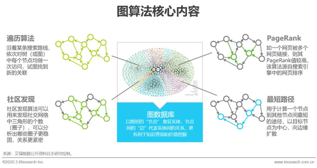 图计算属于大数据挖掘技术的一种,专用于图结构化数据之间关联性的推理运算,基础数据格式与图存储相对应,由代表实体的“点”、代表本体的“边”和边上的权重组成,这里的权重多指一些包含时序性信息的具体数据。图计算算法主要包括全盘访问每一个节点的遍历算法、用于计算社交网络中人际关系的社区发现、源自搜索引擎,用于网页链接排序的PageRank,以及解决图结构中距离问题的最短路径算法,在知识图谱中主要应用遍历算法进行知识推理,以发现实体间隐藏的关系。为了更高效的进行图计算,在应用中会使用图计算系统和计算模型,图计算系统分为单机系统和分布式多机系统,对于大规模图结构存储的计算后者更具有优势。而图计算模型被用于解决图计算因频繁迭代带来的数据读取等待和成本高的问题、对相邻节点和边的计算依赖问题,以及难以在分布不均的区块上并行计算的问题。