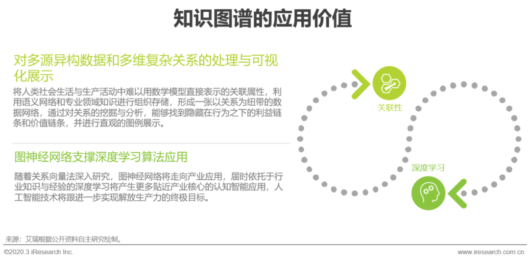 知识图谱是人工智能符号学派中知识工程的代表应用,其核心价值在于对多源异构数据和多维复杂关系的处理与可视化展示,其底层逻辑是将人类社会生活与生产活动中难以用数学模型直接表示的关联属性,利用语义网络和专业领域知识进行组织存储,形成一张以关系为纽带的数据网络,通过对关系的挖掘与分析,能够找到隐藏在行为之下的利益链条和价值链条,并进行直观的图例展示。在面对数据多样、复杂,孤岛化,且单一数据价值不高的应用场景时,存在关系深度搜索、规范业务流程、规则和经验性预测等需求,使用知识图谱解决方案将带来最佳的应用价值。连接主义中的深度学习算法几乎代表了当代整个人工智能技术,但深度学习需要具有明确因果关系的数据对训练,且存在尚缺乏解释性的黑箱问题,在掺杂众多非线性问题的复杂场景中应用价值有限,通过与知识图谱的配合使用,在一定程度上可以解决此类问题,随着关系向量法深入研究,图神经网络将走向产业应用,届时依托于行业知识与经验的深度学习将产生更多贴近产业核心的认知智能应用,人工智能技术也将跟进一步实现生产力升级的终极目标。